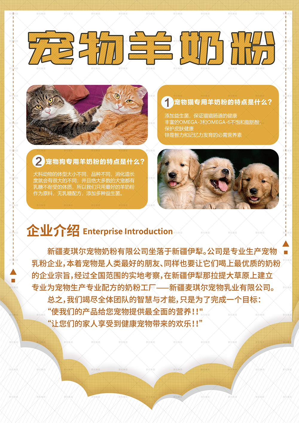 新疆麦琪尔宠物乳业有限公司专业生产、研发宠物奶粉,专业为大客户私人订制宠物奶粉。