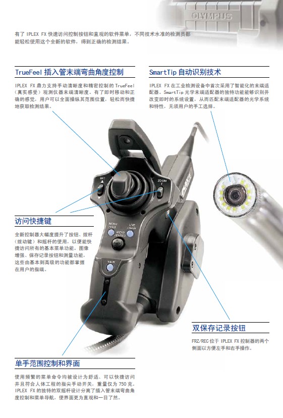 奥林巴斯工业视频内窥镜IPLEX FX是一款将轻便性和高性能结合,将操作简便性和坚固性结合的工业视频内窥镜系统,它可从高质量的图像检查进行检索操作,其多功能性所达到的效果将超出您的体验。