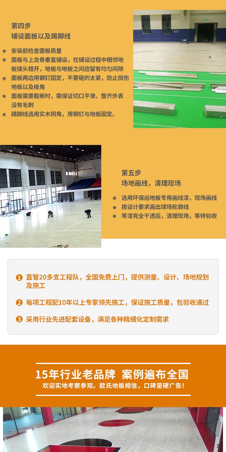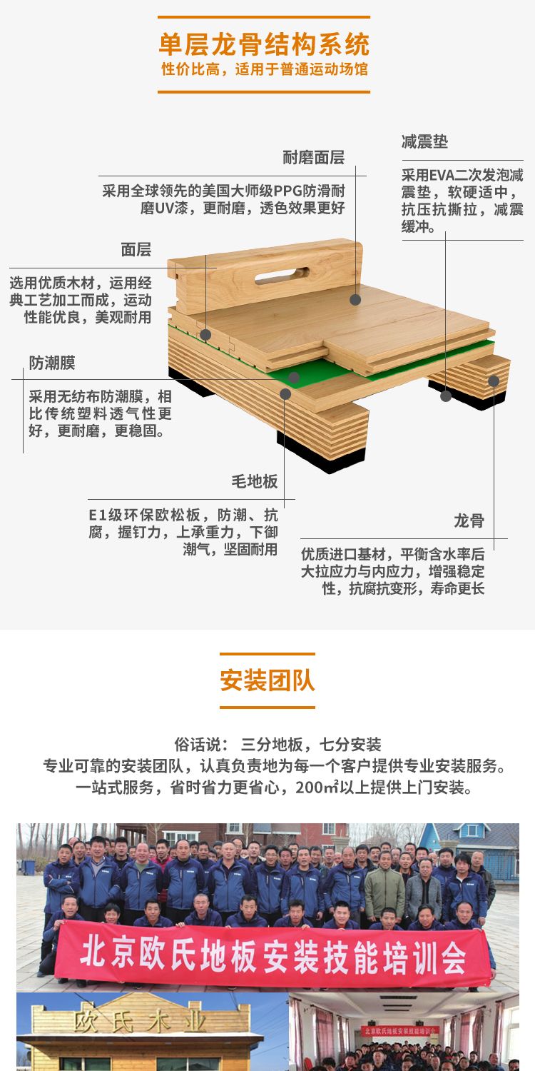 欧氏体育运动木地板依靠雄厚的技术力量及完善的管理体制,坚持“以诚为本,客户至上”的理念,一步一个脚印在市场中开拓、发展,成为中国运动木地板行业的核心力量。