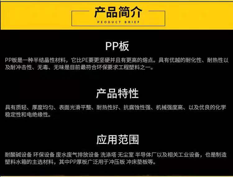 pp塑料板具有隔音、隔热的效果。具有优良的化学稳定性,耐腐蚀性,硬度大,强度高,防紫外线(耐老化),耐火阻燃(具有自熄性),绝缘性能可靠,表面光洁平整,不吸水不变形、易加工等特点,尤生产、储运、施工过程中具1损耗率。