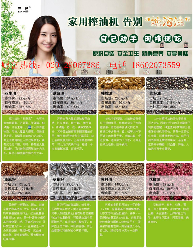 24小时服务热线电话:座机;020-29067286     手机;18602073559   联系人       马文晶,三扬智能家用榨油机是广州三扬机电有限公司发明,是一个全自有知识产权产品,是第一个得到国家3C安全认证的家用榨油机,拥有多项核心技术专利,是小家电的一个重要创新,更是食品史上的一个创举。不但解决了国内食用油安全的问题,将平民百姓带入“专供油时代”,更加给有各种健康营养需要人群提供了多元化新鲜食用油的条件。按照世界卫生组织所提倡,人的食用油应该多样化,才对健康更有利。尽量降低了心脑血管疾病的发生,妇女儿童可以吃到DHA含量很高的核桃油;脂肪肝患者及烟酒人士可以吃到保护肝肺的新鲜芝麻油;美食人士可以吃到香醇无比的花生油...