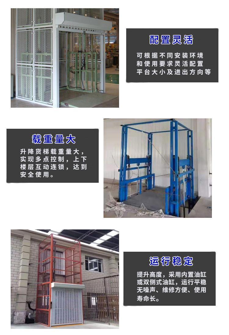 ????导轨式升降平台是一种非剪叉式液压升降机械设备·用于二三层工业厂房,餐厅,酒楼楼层间的货物传输高度在150-300mm,尤其适合不能开挖地坑的工作场所·并且无须上部吊点,形式多样化(单柱,双柱,四柱).设备运行平稳,导轨式升降机的导轨一般为槽钢、工字钢,方管焊接制成,操作简单可靠,货物传输经济便捷