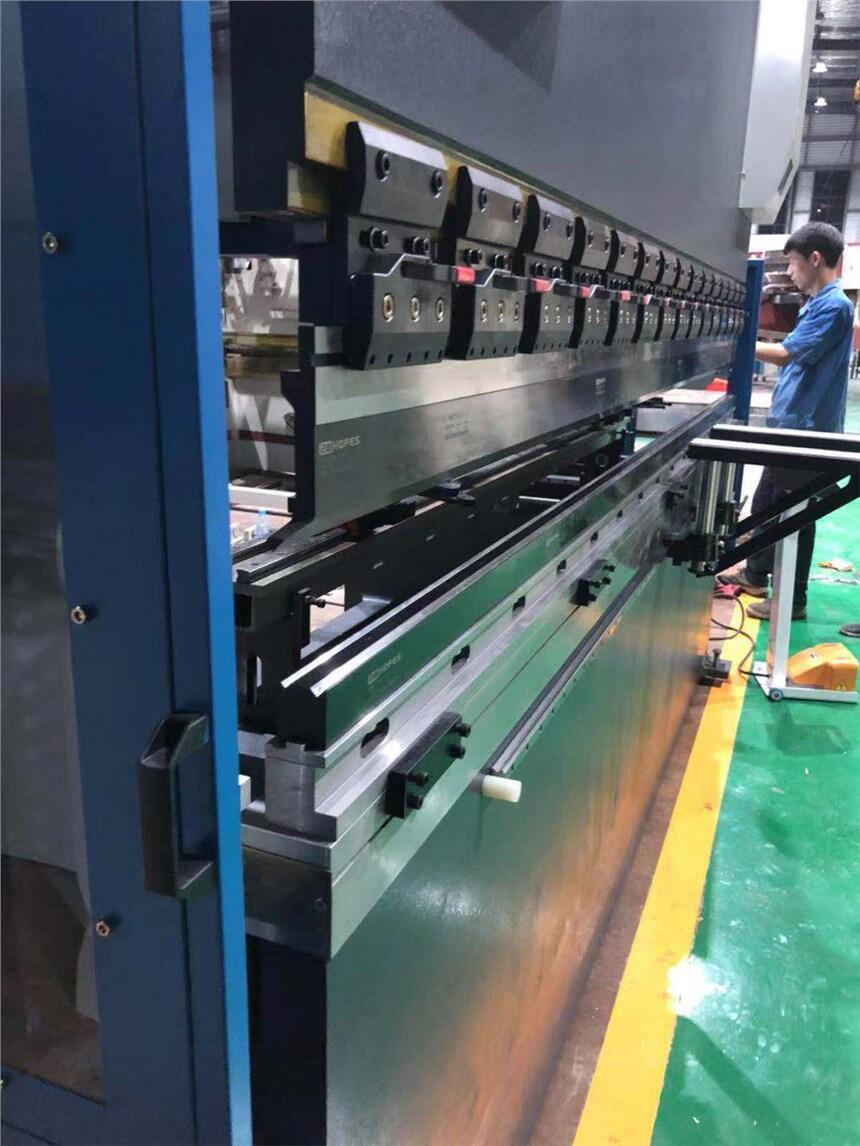 ◆上模采用多件分段短模,拼接所须长度,具有精度高互换性好,便于拆装。连接部分装有补偿机构,在折弯板料时以补偿工作台和滑块的挠度,保证获得较高的工作精度。