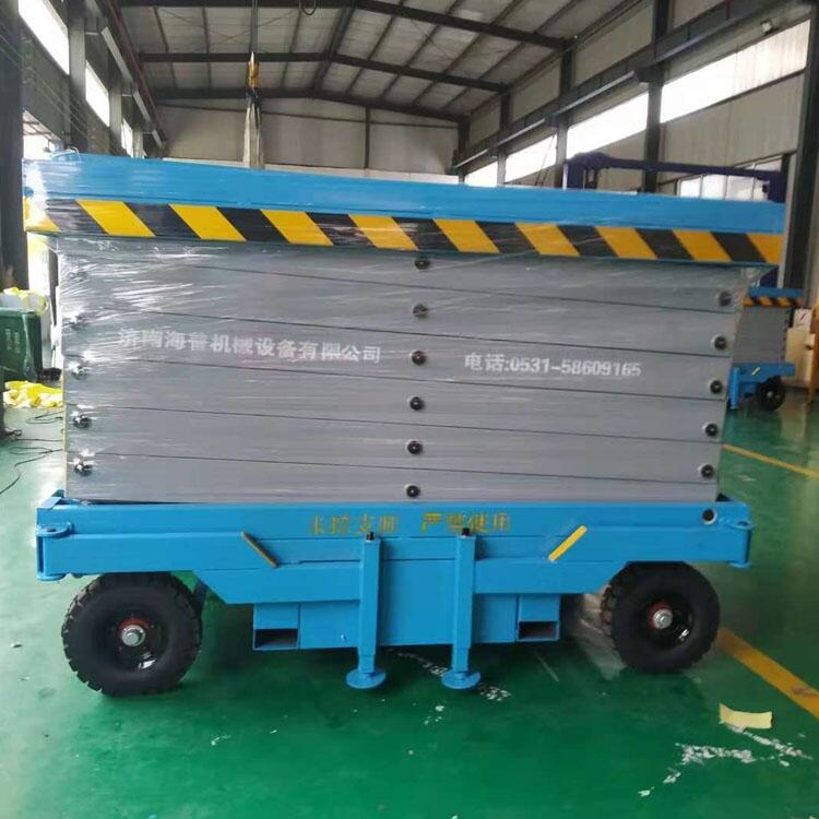 四轮移动式升降机: 该机系列平台为人工移动式,有四个轮子作为移动,简便且平稳。平台各降动力为二相,三相或直流24V,36V电源,也可改为些油机作动力,控制方式有手动控制和电动控制,另备有手压泵和手动下降装置,在停电时仍可正常使用