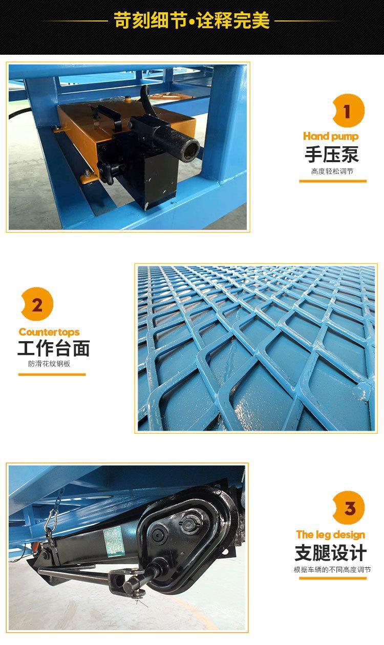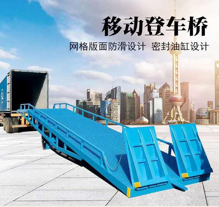 移动式液压登车桥是与叉车配合使用的货物装卸辅助设备,可根据汽车车厢的高低调节高度,叉车可以直接通过本设备驶入车厢内部进行货物的批量装卸,仅需单人作业,即可实现货物的快速装卸。它使企业减少大量劳力,提高工作效率,获取更大经济效益。 产品特点 ;台面采用特制的菱形网格板有可靠的强度,能保证长期使用而不变形。它的菱形网状结构,充分保证了卓越的防滑性能,使叉车有更好的爬坡性和可操纵性。即使在雨、雪天气,仍能保证正常使用。 可调节长度的索链能方便地钩住货车,使登车桥与货车始终紧密贴合。 采用手摇液压泵作动力,勿需外接动力电源即可轻松实现登车桥的高度调节。 配置的刹车垫可有效防止货车装卸时登车桥移位。