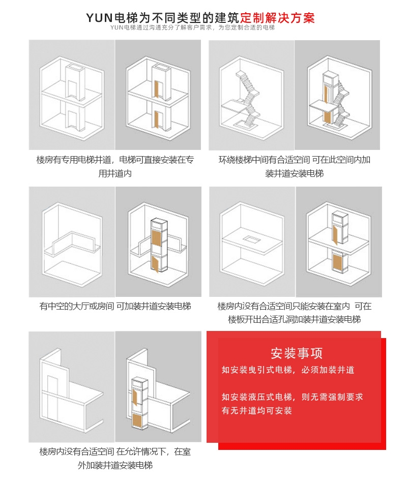 无底坑的家用电梯能分成螺杆式的电梯以及曳引龙门式的电梯,正常家里都是使用螺杆式的电梯。在安装这种类型的电梯时,不用把它的底部拆开,可以直接在地砖的表层上进行安装,而且不会使房屋的结构被破坏,也不会使地基受到影响。弗朗茨小编认为这样施工起来比较方便,并且整体的效率也会比较高。