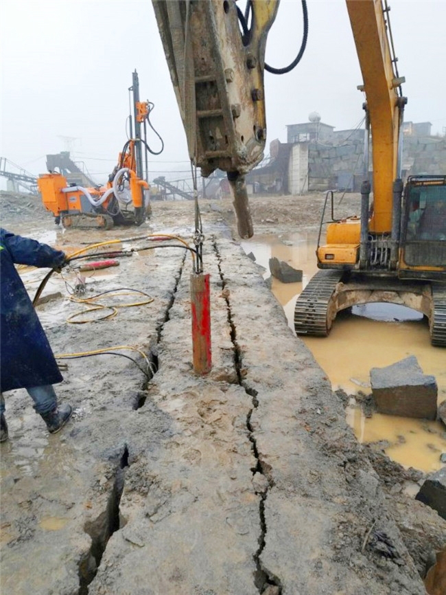 钻孔直径好大达到24厘米以上,挖机吊装放入岩石孔中,两分钟左右产生约1万吨的裂石力可胀裂开石头50立方左右,一天轻松破碎坚石一千立方以上,比传统使用炮锤+切割机或膨胀剂的方式快十倍以上,并且成本更低。技术上实现了岩石钻孔大直径、大间距、大而快,分裂棒大直径、大流量、大强力,动力站超高压、超快速,分裂岩石效果大裂缝、大间距、大产量。