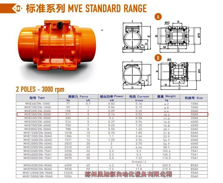 WAM振动电机型号激振力(kg)激振力(kN)振次(r/min)输入功率(kW)电流(A)重量(kg)机座号ABCDEF?GHILM?N电缆插座标准MVE60/3M660.728900.080.434.5SIZE1062-7410621113013612948941214586M16×1.5MVE100/3M9912890440.194.6SIZE1062-7410622113013612948941215086M16×1.5MVE200/3M19722890600.356.8SIZE2062-741062311311591596412112354112M20×1.5MVE300/3M31132890640.529.8SIZE309012525315417515137914216345131M20×1.5MVE400/3M40042890740.5810.3SIZE309012527315417515137914216355131M20×1.5