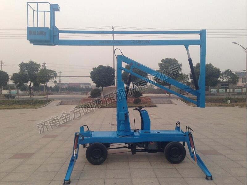 ?????曲臂式升降机具有操作简单、使用方便、作业范围广、作业半径大等特点。它能够360度旋转,并且够悬伸作业,在空中能跨越障碍物进行工作;它具有自行走功能,不需要设备牵引,就能长距离移动,进行跨度大的多点作业。