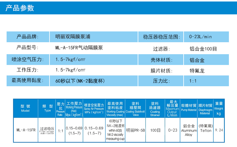 明丽ML-A-15FR过滤稳压气动双隔膜泵油漆喷涂喷漆泵