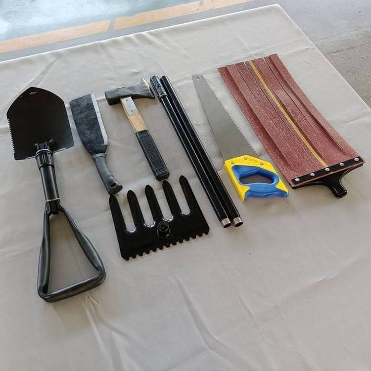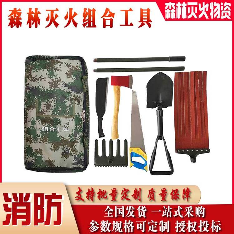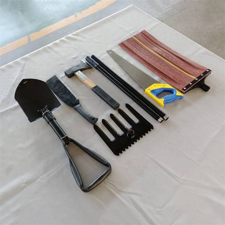 1.由砍刀、手锯、伐木斧、铁锹(镐)、扑火拍、七齿耙、两节连接杆,工具包等8件组成。