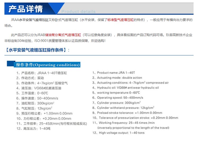 JRAA水平安装气液增压缸2年免费保修非标定制