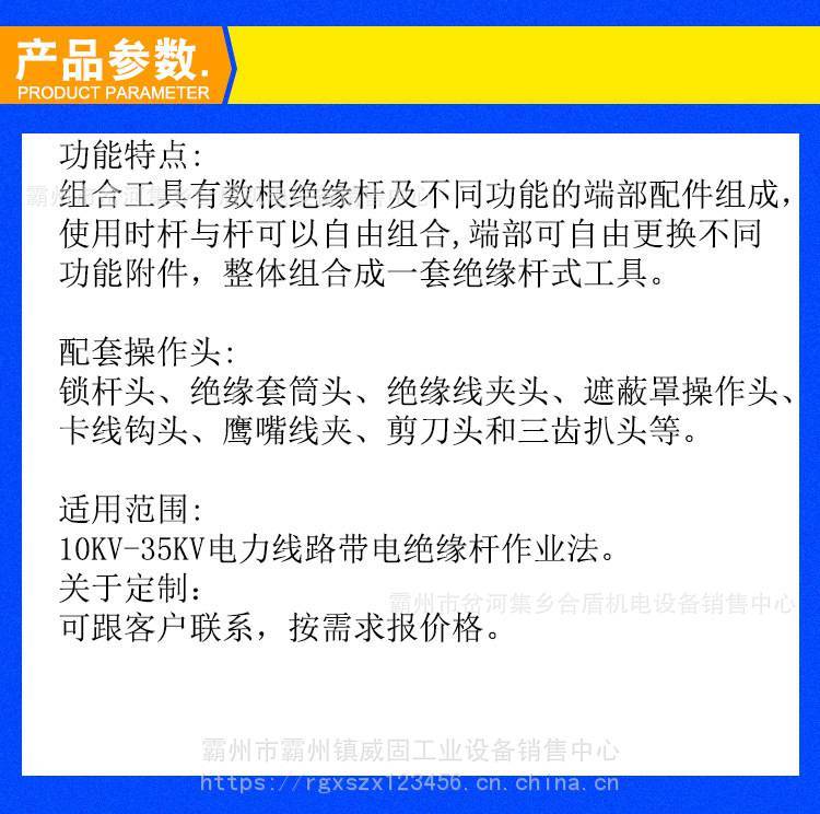 组合工具有数根绝缘杆及不同功能的端部配件组成,使用时杆与杆可以自由组合,端部可自由更换不同功能附件,整体组合成一套绝缘杆式组合工具
