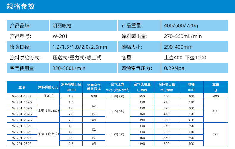 明丽W-201油漆喷枪家具木门水性漆专用空气雾化上下壶底漆喷涂枪