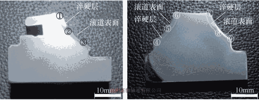 用数码显微镜观察轴承外圈淬硬层的低倍金相组织,如图10所示。分别测量图10中各点的淬硬层深度,结果如表4所示。可见其滚道淬硬层深度在0.9~2.9mm分布,未达到GB/T 29717—2013所要求的≥3.5mm。