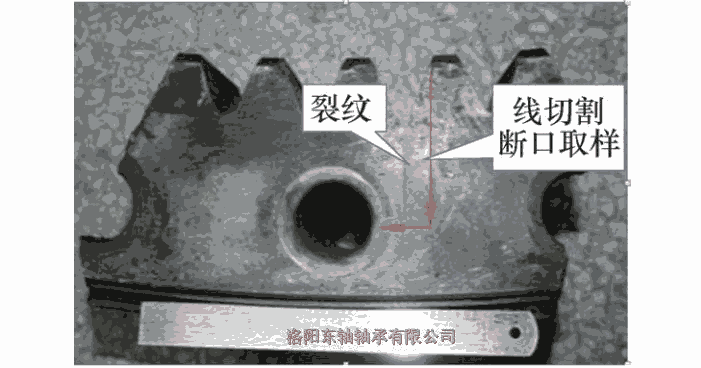 (2)断口宏观检验宏观可观察到轴承内圈螺栓孔附近有一条长约70mm的裂纹,从齿根向滚道方向扩展,未完全穿透整个轴承截面,如图1所示。用线切割取出裂纹(断口),经清洗后拍照,如图2所示。从断口宏观形貌可以观察到典型的贝纹线特征,表明变桨轴承为疲劳开裂。从贝纹线走向,可判断疲劳源位于变桨轴承内圈轮齿的齿根处。