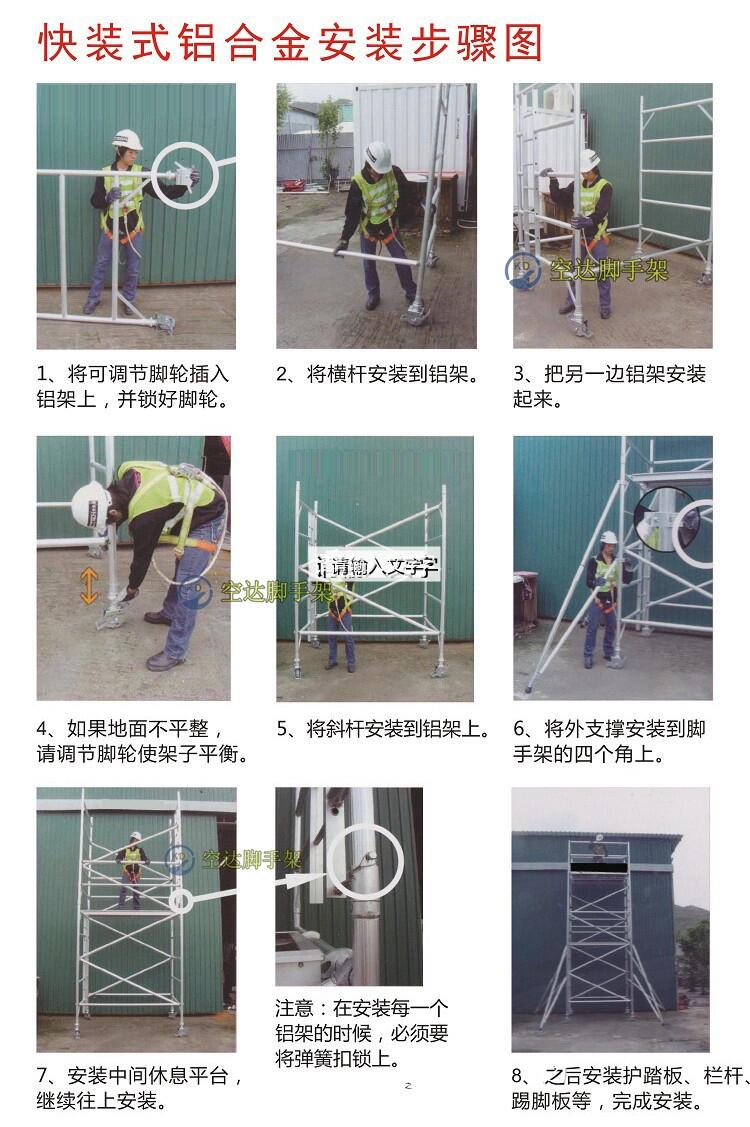 在各种大小工程中,移动铝合金脚手架是一种常见的施工器材,与固定式脚手架不同的是,通过安装脚轮的方式使得的脚手架具有移动的功能,还能通过脚轮自带的锁止装置让脚手架固定在需要的位置,和可调底掌一样,也可以调节脚轮支撑杆的高度,让脚手架保持水平的位置,在各种规模的施工项目中,很重要的问题就是安全。