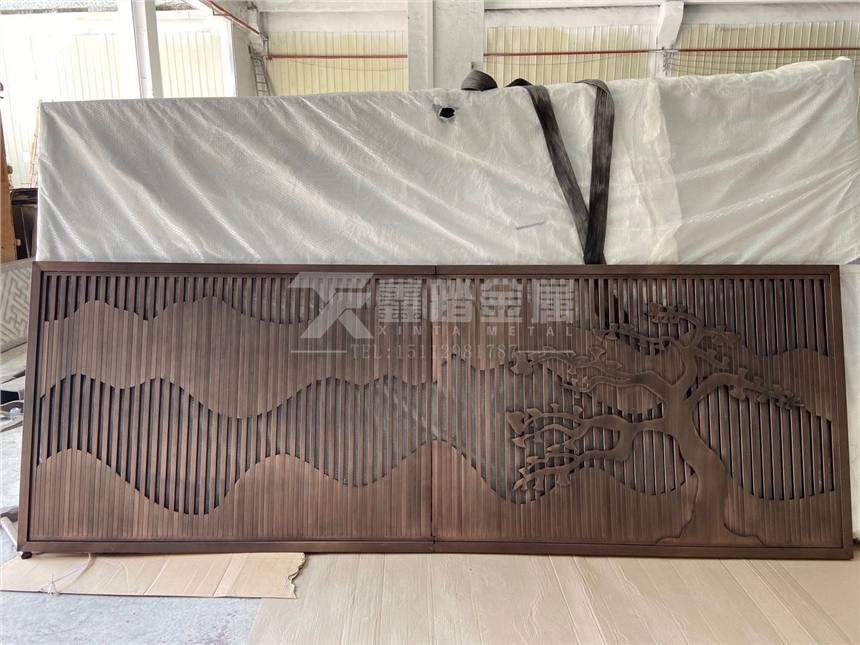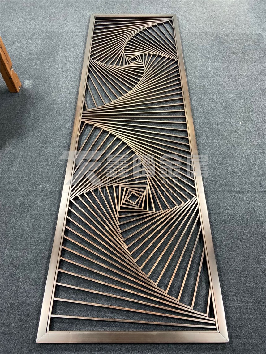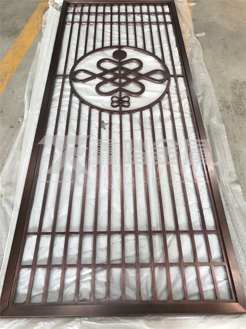 纳米喷涂红古铜不锈钢激光铜钱花格屏风做旧工艺做出来的效果很复古有年底代感。纳米喷涂拉丝红古铜不锈钢屏风作品不能归属为现代有价值的屏风,关于现代屏风的定义必须从传统屏风与现代屏风的对照来界定。但是具备装饰作用当然现在生活中的一些现象往往是有偏差的,现代生活中生产出来的物品未必就能称之为有价值的物品,在古代的屏风中就有很古董的,格调很低谷的来充代艺术纳米喷涂拉丝红古铜不锈钢屏风。