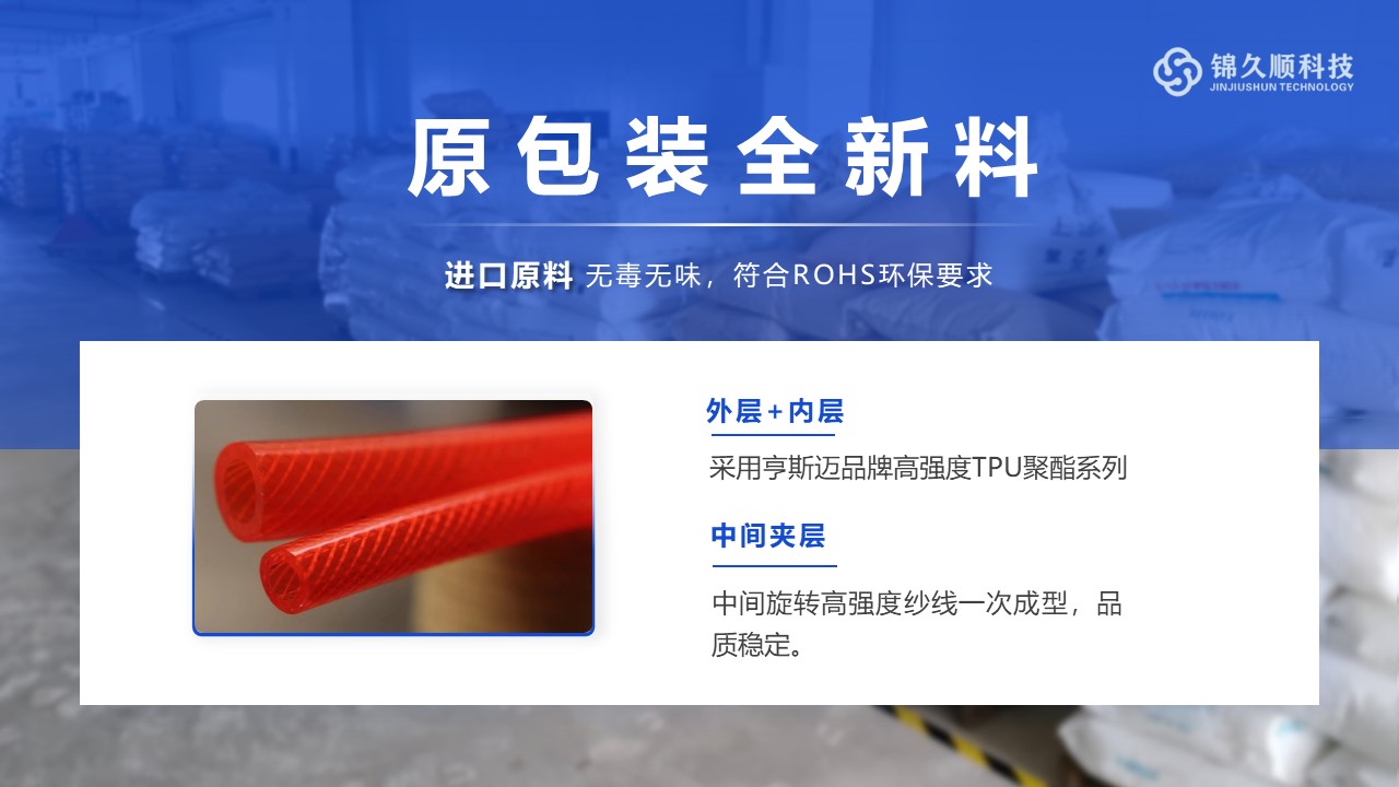 1、JINDA?锦达牌TPU聚醚夹纱管,采用亨斯迈品牌高强度TPU聚脂系列全新料生产,无毒无味,符合ROHS环保要求。