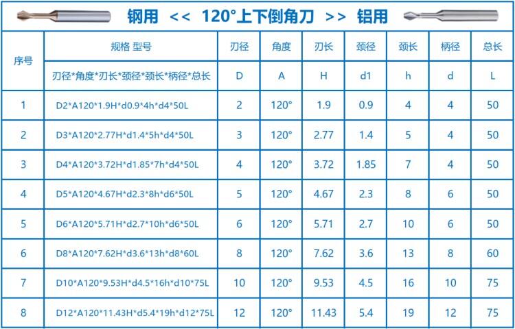 这是整体硬质合金一体的“上下倒角刀”,加工钢件选择涂层款,加工铝件选用非涂层款,角度有60°、90°和120°三种,可根据加工需求特殊定制。