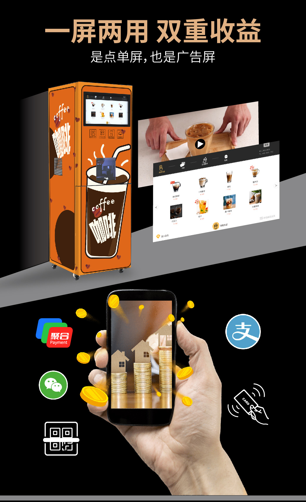 营销方式机器自带广告屏/后台自带会员营销功能