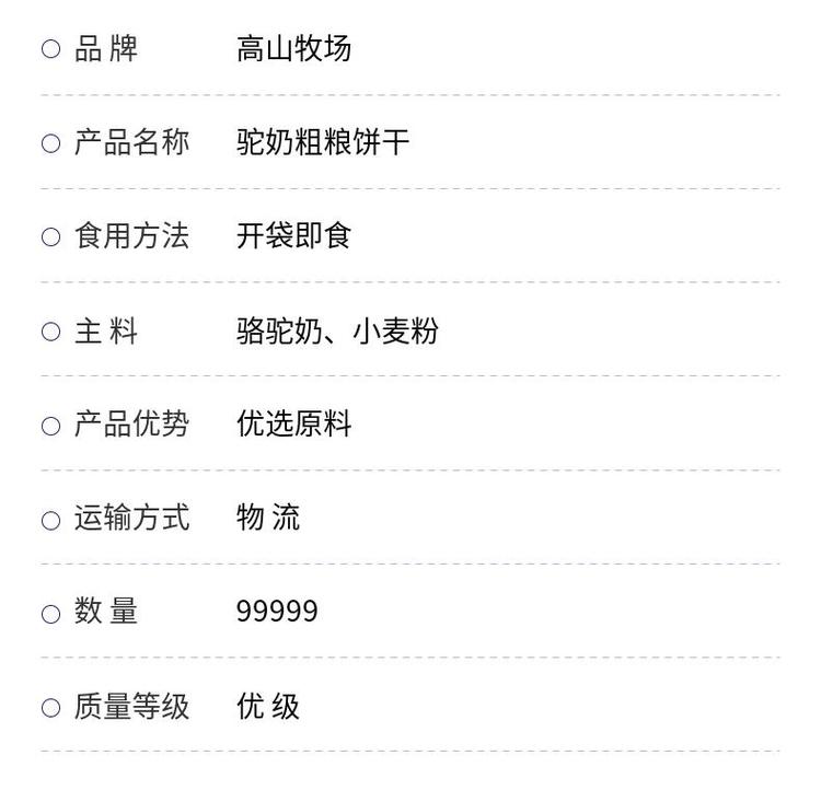 产品名称 | 驼奶粗粮饼干 | ||