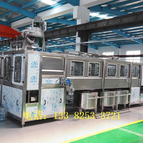 大桶水设备清洗传动方式精确定位出错自动报警。大桶水设备清洗过程采用PLC控制,冲洗头深入桶内部的方式,喷洗均匀,效果好、无死角;桶内、外壁均为带压力水喷洗,伸入式旋转内洗,喷头伸入桶内进行360°无死角冲洗。大桶水设备设有热碱液冲洗、高温巴氏杀菌、消毒液冲洗、回流水冲洗、成品水冲洗、滴干等工位;循环水箱底部排水及清洗方便。大桶水设备水箱均设有加液斗,加热工序顶部设有斗形抽气装置,可快速有效地降低机内雾气的浓度;热碱液箱采用双层保温设计,温度自动控制。大桶水设备水箱均设有清洗消毒的人孔,方便操作者定期对水箱内部进行清洗和消毒;清洗机在相关洗桶工序配有吹气装置,吹掉五加仑桶底积水,减少窜水。大桶水设备工序间设有水帘,降低窜水情况;所有的观察窗安装有机玻璃。