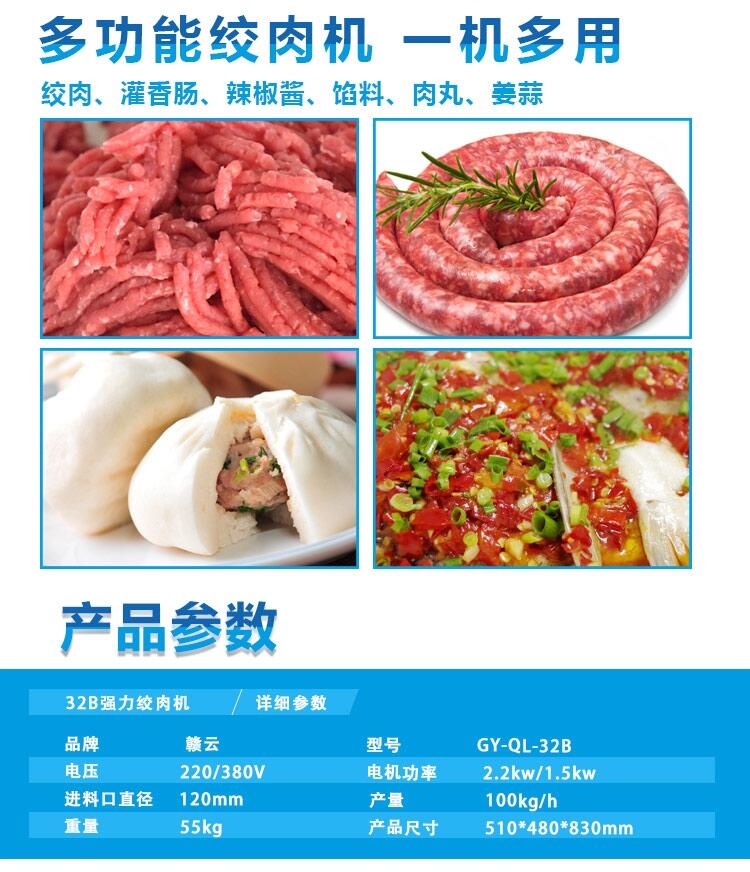 不锈钢绞肉机具有功率小效率高,大大减少人工劳动强度,完全模仿人工绞肉,口感完全是人工剁出来的口味等特点,刀具采用台湾专用刀具 是理想的肉馅加工设备,也是包子店,饺子,店饭店 酒店,连锁店理想的配套设备。 新型绞肉机模仿的是纯手工绞肉的原理,两把刀交替剁在肉板上的鲜肉,此设备解决了绞肉机绞肉时通过挤压出来的肉馅口感问题,可在短时间内把鲜肉绞成肉馅,电机为无级调速,可旋转机头,操作简单,省时省力,剁一次肉的时间在三分钟内,是肉店、饺子店、餐饮连锁店的首选设备。剁肉机所剁肉馅不仅保证了人工所绞肉馅的口感,同时也提高了工作效率。 赣云每一种产品都精工制作。专业质造15年,品质有保障。