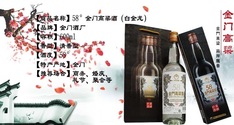 58度金门高粱酒特级高粱白金龙黑盒600ml/750ml。600ml/750ml特级金门高粱酒58度黑盒白标白金龙