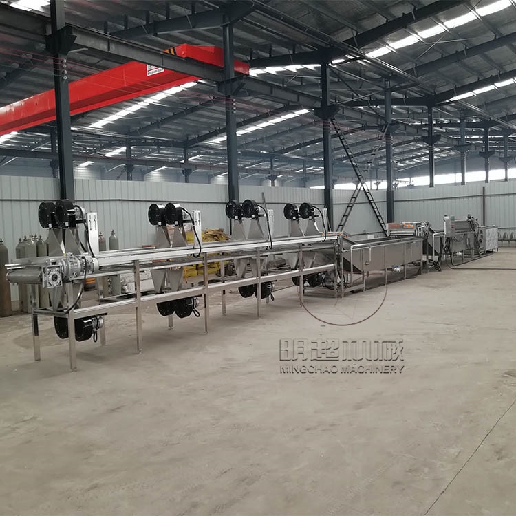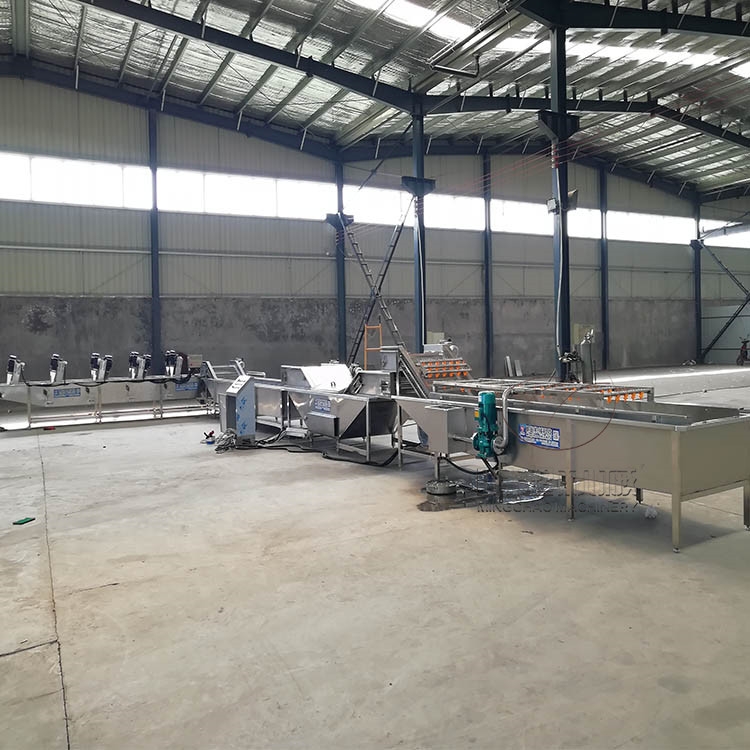 毛豆清洗机是水果蔬菜加工和净菜生产中工序之一,为此,设计了毛豆清洗机作为果蔬清洗动力的新型果蔬清洗机。实验证明,物料进入水槽,在高压水流和强 力气泡的作用下,被充分打散、翻滚、清洗、传送,从物料表面洗脱的泥沙沉入底部隔离仓,不会发生翻扬回流造成的再度污染。漂浮在水中的杂物、小虫通过去杂 机构的网孔手机,细丝、头发、等通过毛辊清理掉,洗净的物料出水口再经喷淋清洗送至下道工序。毛豆通过人工进行挑选,通过输送机或者提升机提升到毛豆清洗机里面进行清洗,能有效的将毛豆表面的杂质和异物清洗干净,设有过滤装置,水可循环利用,输送提升段设有高压喷淋端,能对毛豆进行深层洁净,通过毛豆清洗提升段输送到下一工序,毛豆漂烫机,漂烫的时间和温度可进行调试,设置好后,先将水分提升上来后,才开始工作,将毛豆进行5-10分钟的漂烫,漂烫时间根据需要制作的产品为宜,每个产品的漂烫时间和温度是不一样的,能水温达到均衡的状态,毛豆在水里面进行漂烫的过程中,不会出现漂烫不均匀,漂烫好的毛豆,迅速进入到冷却池里面冷却,冷却可分为常温或者冰水,这个客户可根据自己工厂的实际情况确定,冷却好的毛豆自动输送到速冻机里面进行速冻,能达到迅速速冻。
