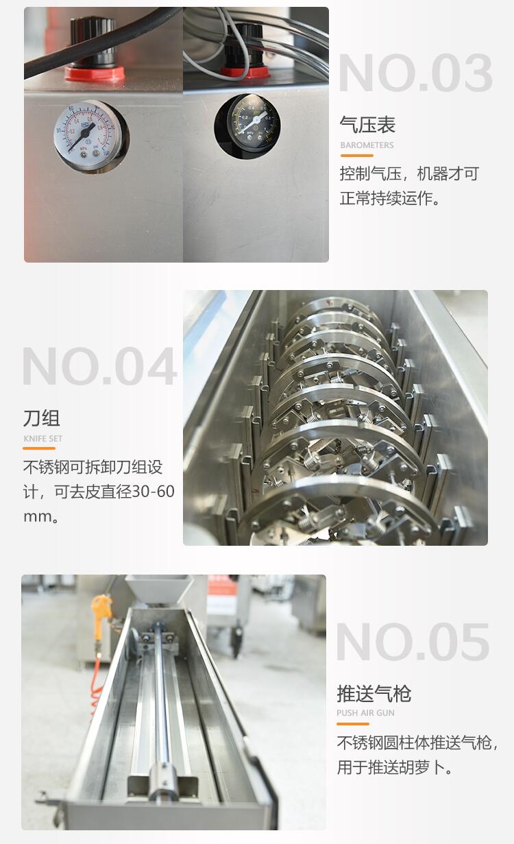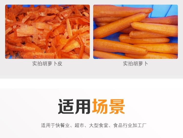7.特点:仿人工削皮,削皮后的物料表面平整光滑,去皮胡萝卜率可达98%左右;360°万向移动脚轮,方便设备移动;304不锈钢材质制造,结实耐腐蚀。