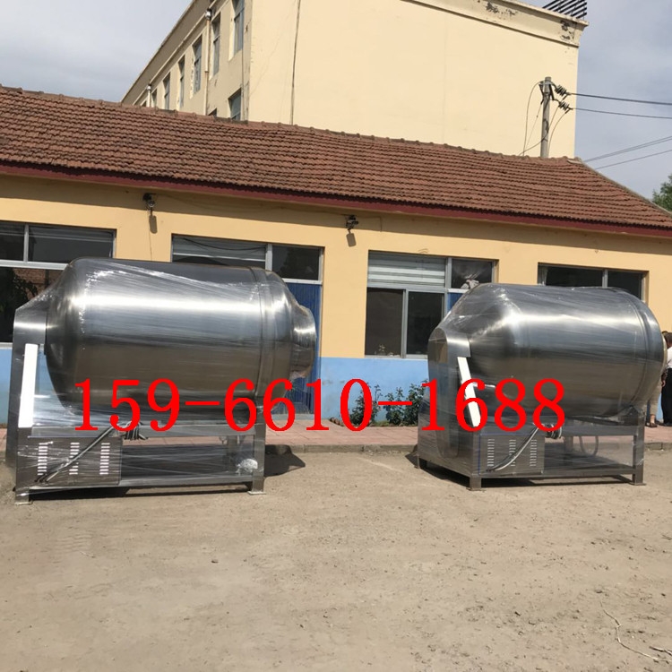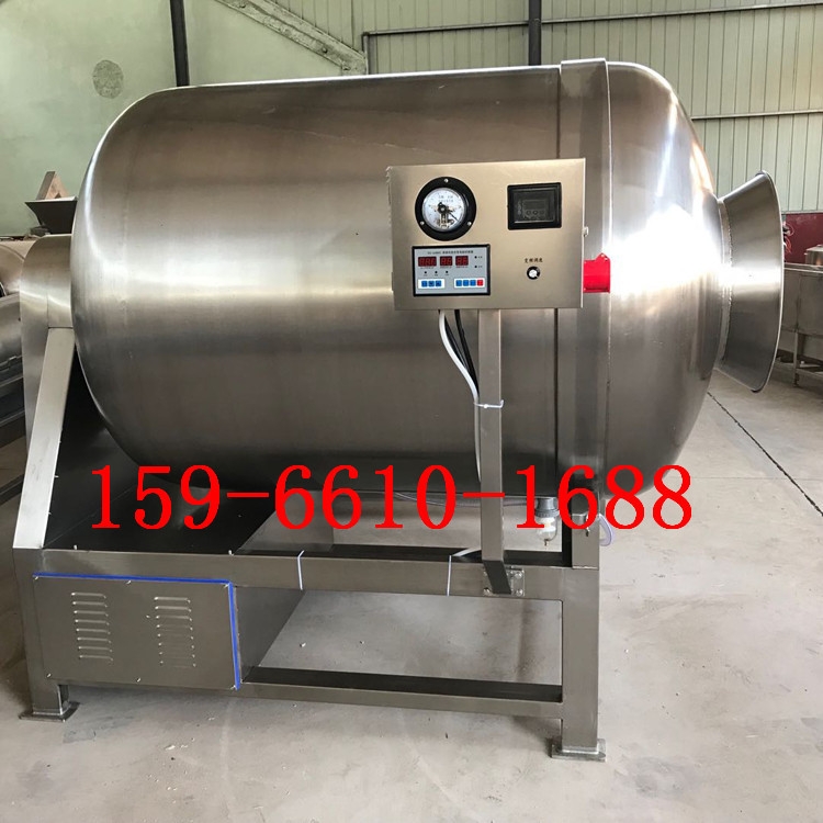 真空滚揉机是在真空状态下,利用物理冲击的原理,使肉产品在滚筒内上下翻动,相互撞击、摔打,达到按摩、腌渍作用,使肉均匀的吸收腌渍,提高肉的结着力及产品的弹性,通过滚揉、按摩能使肉体蛋白质分解成水溶性蛋白,易被人体吸收,同时能使添加料(淀粉等)与肉体蛋白质互为融合以达到肉质变嫩,口感好,出品率高。本机具有肺呼吸功能,让产品在滚筒内膨胀、缩小了往复运动,改善了肉组织的结构,提高了切面效果。