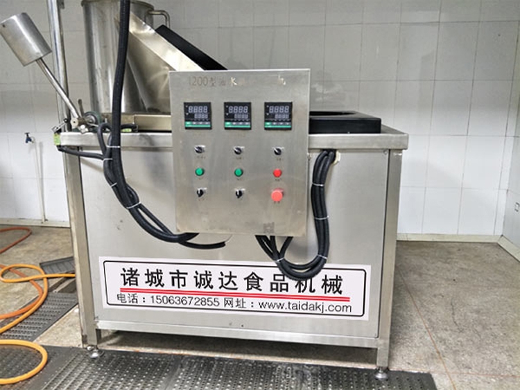 休闲鱼豆腐生产机器巧用原理使油不变质,利用油、水、动物油的比重不同的原理在工作过程中产生的残渣全部沉入水中,动物油脂沉入植物油下层,从根本上解决了传统油炸机中残渣、动物油脂、反复油炸使炸油酸化碳化而变质产生致癌物的问题。