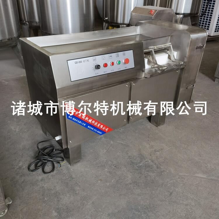 冻肉切丁机 猪喉管切条机 鲜肉冻肉切丁机可以实现无骨肉类的切丁加工和果蔬类的产品的切丁加工的,也就是可以当切肉机使用的同时还可以实现切菜机的一个功能的,这款机器对于入料的原材料是有要求的,需要根据入料槽尺寸来确定的,如果是冻盘比较大的产品的话是可以配套冻盘切块机或者是据骨机来使用的。