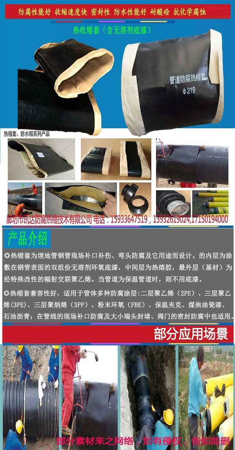 热收缩套由性能优异的热熔胶、辐射交联聚乙烯基材、无溶剂环氧底漆等材料组成防腐性能好、收缩速度快、密封性、防水性能好。