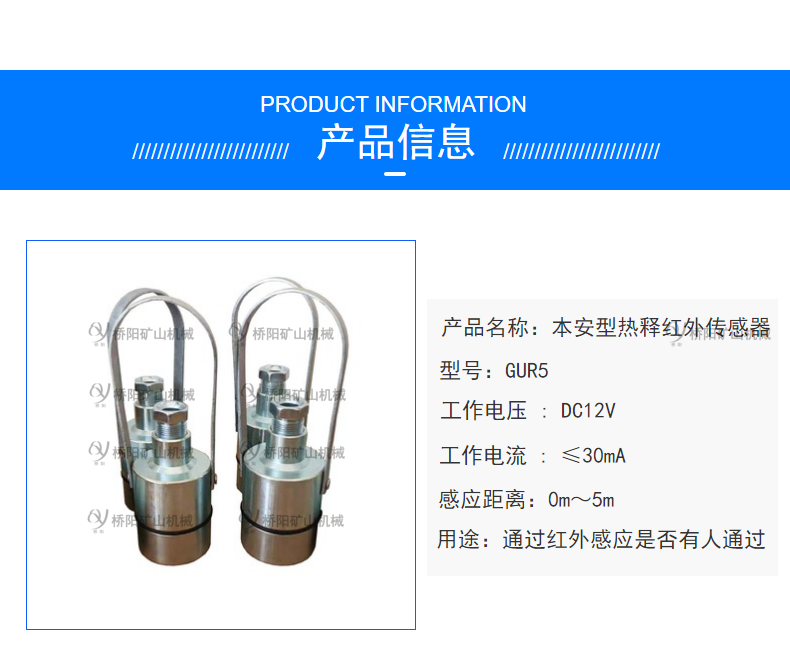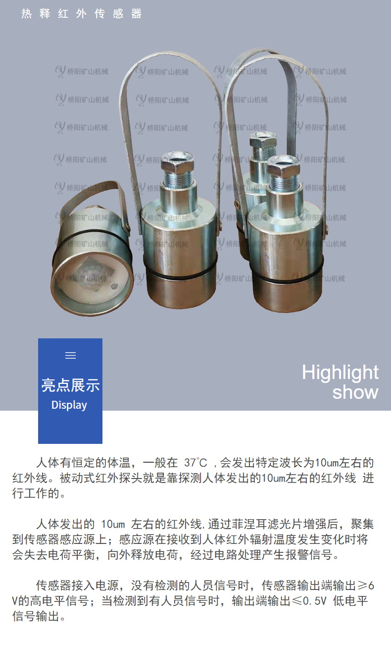 装载机用GUR5热释温控传感器人体传感器用途:用于煤矿井底车场、猴车沿线等场所作人员检测用,实现声光报jing或语音提示,提醒现场人员注意安全。