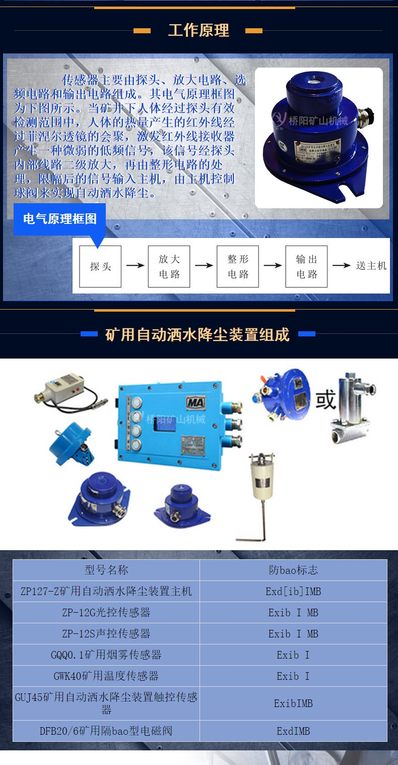 ZP-12R矿用自动酒水降尘装置用热释光控传感器(以下简称传感器),该传感器使用方便;适用于有baozha危xian的气体(甲wan)和煤尘的矿井的采掘面、运输大巷、井底车场、皮带输送机、储煤仓场等作业环境,该传感器通过与ZP127-Z矿用自动酒水降尘装置主机(以下简称主机)连接组合成自动酒水降尘装置,不仅能够降尘除尘,净化空气,同时能够吸收一定的有hai气体,降低wasi浓度及环境浓度,是改善和治理粉尘作业环境,youxiao防止粉尘的设施。