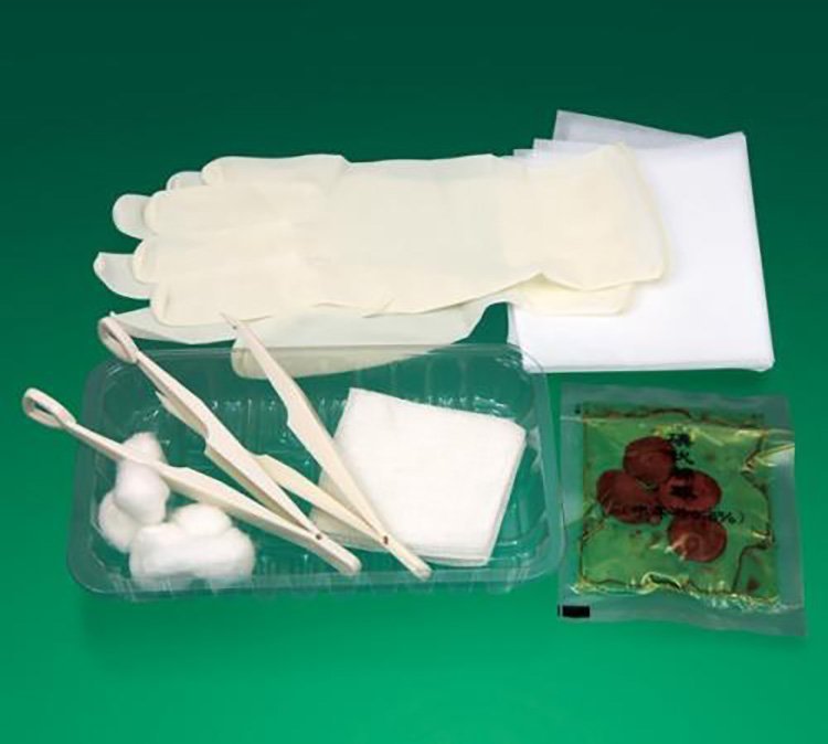 【结构与组成】本产品由基本配置和选配置组成。I型(缝合型)由基本配置:医用脱脂纱布块、医用棉球、医用镊、一次性医用包布、托盘和选用配置:剪刀、一次性使用孔巾、一次性使用医用橡胶检查手套、非吸收性外科缝线、医用缝合针、无菌塑柄手术刀、自粘式伤口护贴组成、一次性使用灭菌橡胶外科手套。II型(换药型)由基本配置:医用镊、医用脱脂纱布块、碘伏棉球、托盘和选用配置:一次性使用医用橡胶检查手套、一次性医用包布、医用棉球、一次性使用孔巾、一次性使用治疗巾、一次性使用中单、小碗、一次性使用灭菌橡胶外科手套组成。
