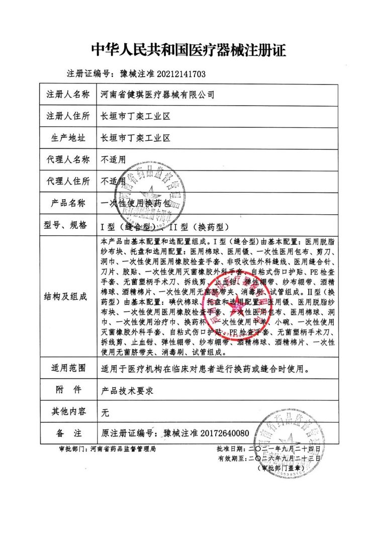 16、一次性使用治疗巾应为取得医疗器械注册证的合格产品。