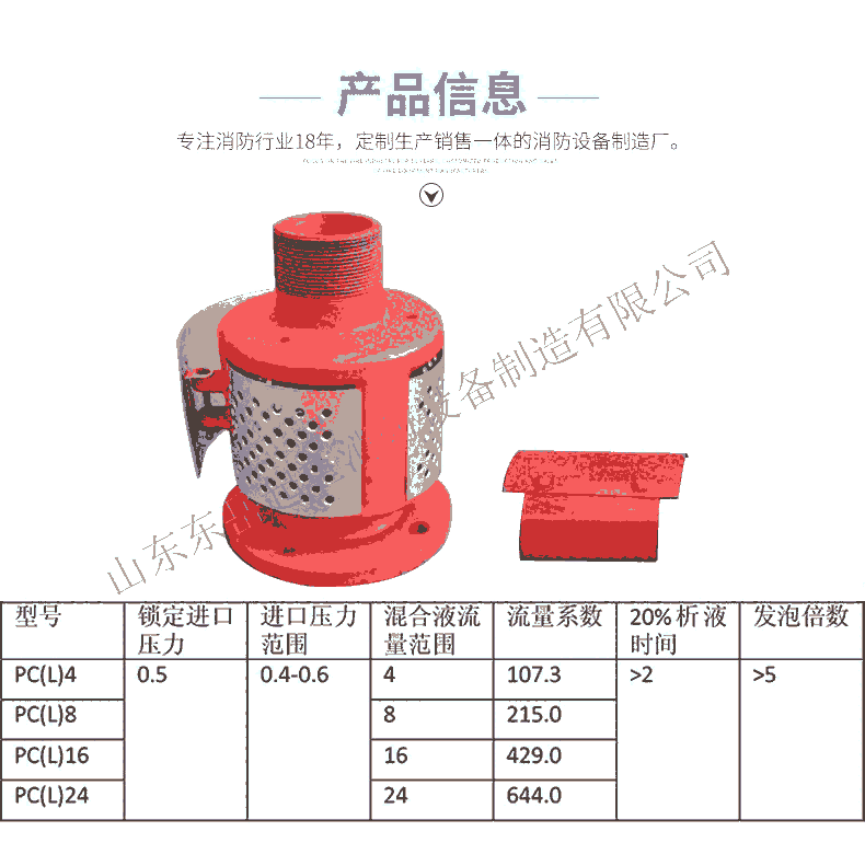 PC系列液上喷射空气泡沫产生器是一种水平固定安装在油罐顶壁上,能产生和喷射空气泡沫的灭火设备。当泡沫消防车或固定消防泵供给的泡沫混合液流经输送管道通过泡沫产生器时,形成空气泡沫,扑灭油类火灾。 空气泡沫产生器主要由泡沫产生器主体,泡沫喷管组和导板组三个部分组成。当泡沫混合液通过产生器喷嘴时,形成扩散的雾化射流,在其周围产生负压,从而吸入大量空气形成泡沫,空气泡沫通过泡沫喷管开口喷入罐内灭火。