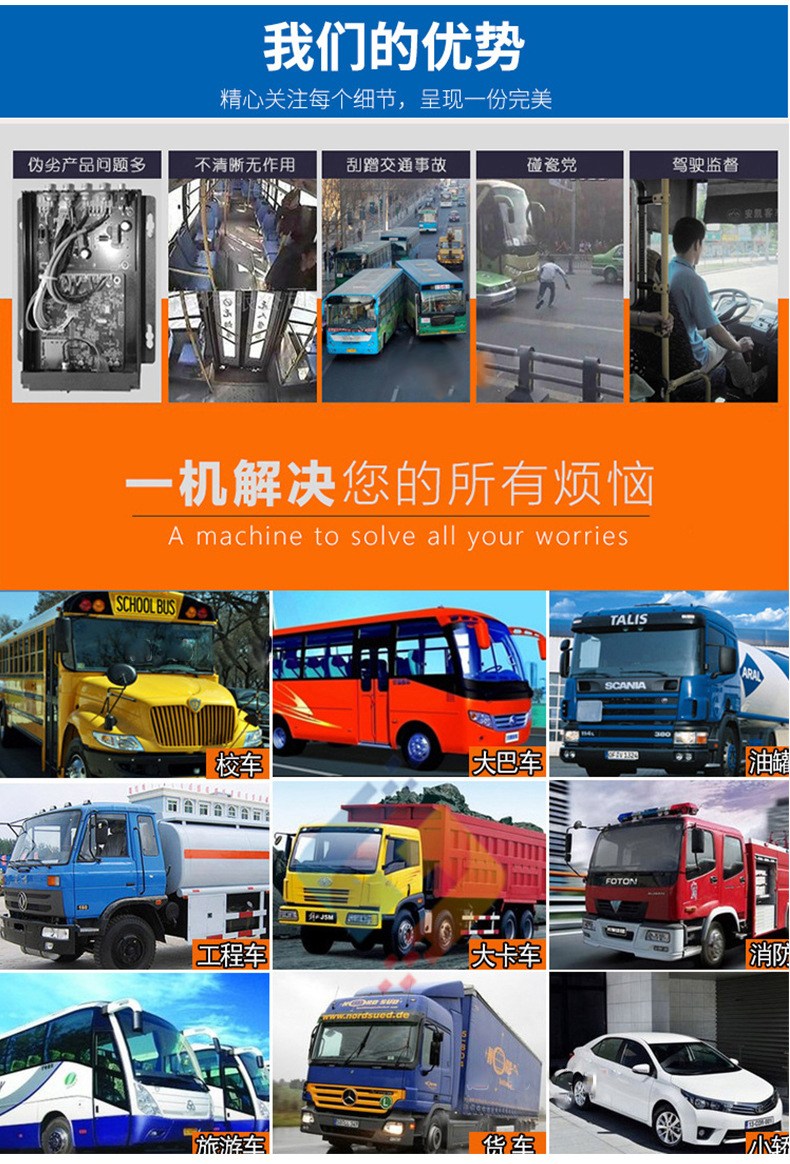 监控摄像头分别安装在车内后视镜边、前门、后门,全部为车载专用广角摄像机,即使是没有任何光照的夜晚,也能保证看清现场情况;前门摄像机:安装在驾驶员座位左上方,主要监控司机的驾驶行为及前门上下客,可以监控乘客投币、刷卡或售票过程,防止逃票和司乘人员窃取票款的行为。可在此处配置拾音器(麦克风)实现录像的同时录制司机与乘客之间的谈话;后门摄像机:该摄像机安装在车厢后门的顶部,监控范围是车厢后部及后门,可以监看和记录车厢后门情况,杜绝夹伤乘客事故的发生和防范不法分子作案;车内后视镜边摄像机:安装在后视镜旁边,可以监控整个车厢内情况,防范打架斗殴及偷窃事件的发生,保护乘客的安全。