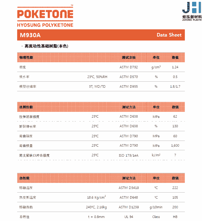 高热变形温度---POK的热变形温度是200度,优于其它材料,可以在高温环境下使用。