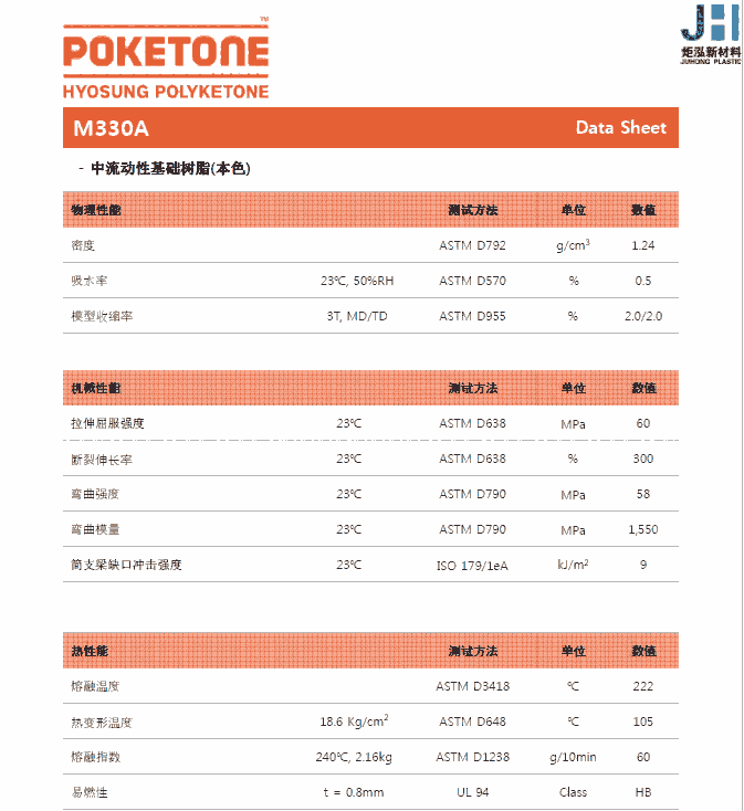 高热变形温度---POK的热变形温度是200度,优于其它材料,可以在高温环境下使用。