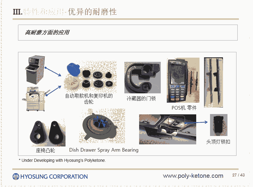 聚酮POKETONE材料:是韩国晓星集团研发生产出的一种综合性能极其优良的工程塑料,属于聚酮类材料。POKETONE是全部主链都由碳素组成的工程塑料,是高结晶性、结实的结晶结构,表现出耐冲击性、耐磨损性、耐化学性、耐燃料性、气体阻隔性能。