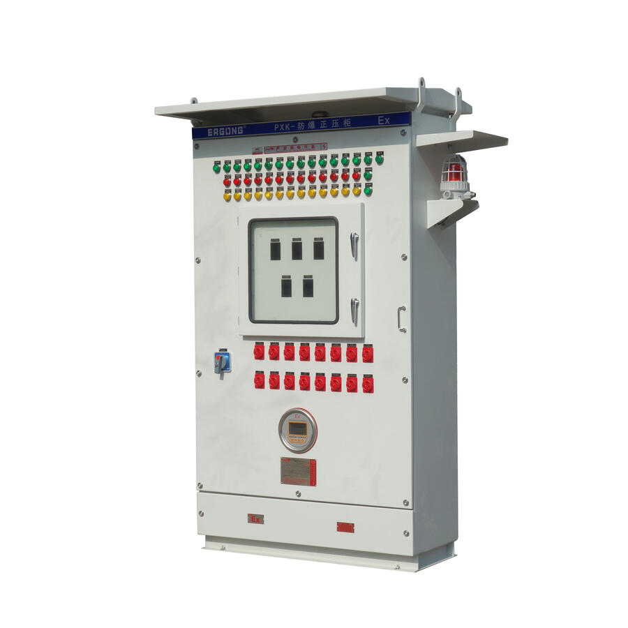 5.本产品适用于石油化工、海上钻井平台、冶金、、轻工、纺织、酿酒、油漆、涂料、食品、生物工程、**航空工程以及设施等工厂中; █??产品特点 1.?本产品外壳采用**钢板焊接或不锈钢焊接成型,表面经高速抛丸后粉末静电喷塑,外形美观; 2.本产品为“二工电气”改进型防爆产品,可根据用户要求安装各种普通的检测仪表、分析仪表、显示仪表、变压器、软启动器、变频器、PLC、各种按钮、开关、微电脑触摸屏以及普通电器元件,对用户需装电器元件不受限制; 3.采用多样化设计,可选择柜式(上下形式,左右形式)、壁挂式、琴台式、平面式等; 4.配电柜由柜体、控制系统、布气系统、报警系统、配电系统组成;正压腔内装部分控制系统的防爆元件及用户的配电系统元件(也可根据客户要求订做分体式或联机式); 5.本左右柜进气方式为通风型,即不间断连续供气,正压腔内装元件的工作热量可随气路带走,具有很好的散热效果。 6.本产品引用GB3836.1-2000?,GB3836.5-2004以及相关标准设计、制造、检验。 正压柜在自动控制系统的控制下,通入保护气体,正压腔内压力**正压腔外的压力,形成微正压的小环境,从而阻止了可燃性危险气体进入正压腔内,*内装普通仪表和电器元件的运行。