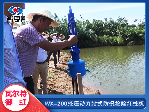 WX--200型动力站式防汛抢险液压打桩机(WX--200型动力站式防汛抢险液压植桩机)是一种国内先进的、使用轻便快捷的液压动力站做为打桩作业动力源的手持式、多功能、高频、防汛抢险打桩新设备。