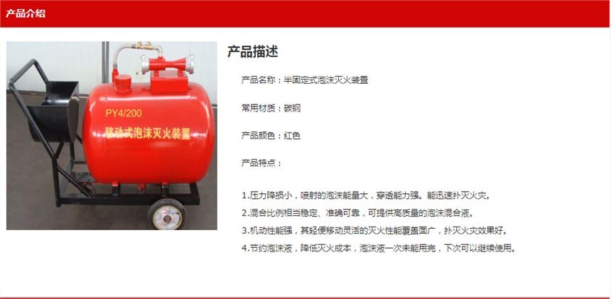 半固定式(轻便式)泡沫灭火装置,轻便式(半固定式)泡沫灭火装置工作原理及使用方法:将供水源接口与装置的进水接口相连接,并提供不低於0.20MPa的压力水,压力水流轻比例混合器低压型腔时,使低压型腔产生负压,即将装置内泡沫液吸出并自动按一定的比例混合,混合液经输送水带流向泡沫发射枪,混合液经泡沫发射枪喉管喷出时,再次与空气混合进行发泡,半固定式(轻便式)泡沫灭火装置,轻便式(半固定式)泡沫灭火装置最后泡沫混合液由枪口喷出进行灭火。