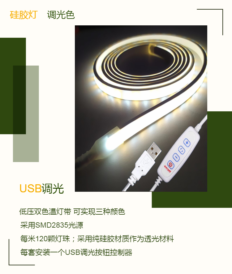 户外野营灯带5V双色温灯带超薄硅胶USB迷你调光器2835低压灯带
