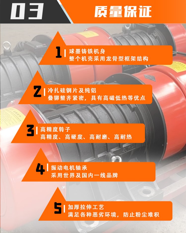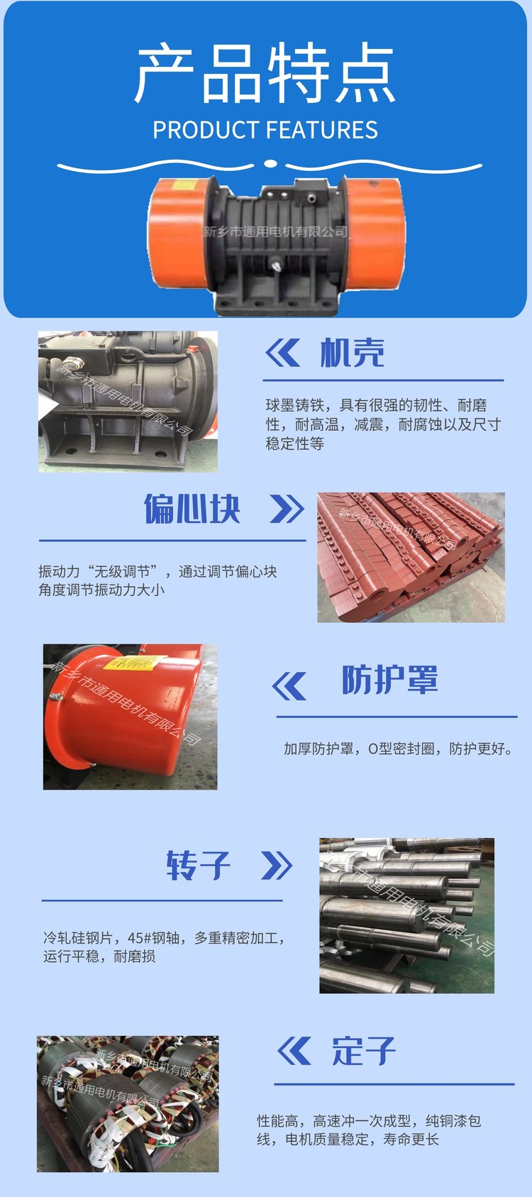 YZU系列振动电机整机采用了树脂砂铸造工艺,机壳、机体一体铸造,不容易断腿,机壳机身有散热筋,散热效果好。国标铜线线包,真空浸漆工艺,电机不容易烧毁。加强了整机的密封性能。可广泛应用于多粉尘、多颗粒状物料的无防爆要求的工作环境。外形美观,性价比高。可以广泛的应用在采矿、煤炭、冶金、水电建设、火力发电、建筑、建材、化工、粮食、轻工等工业部门振动筛分机械领域。