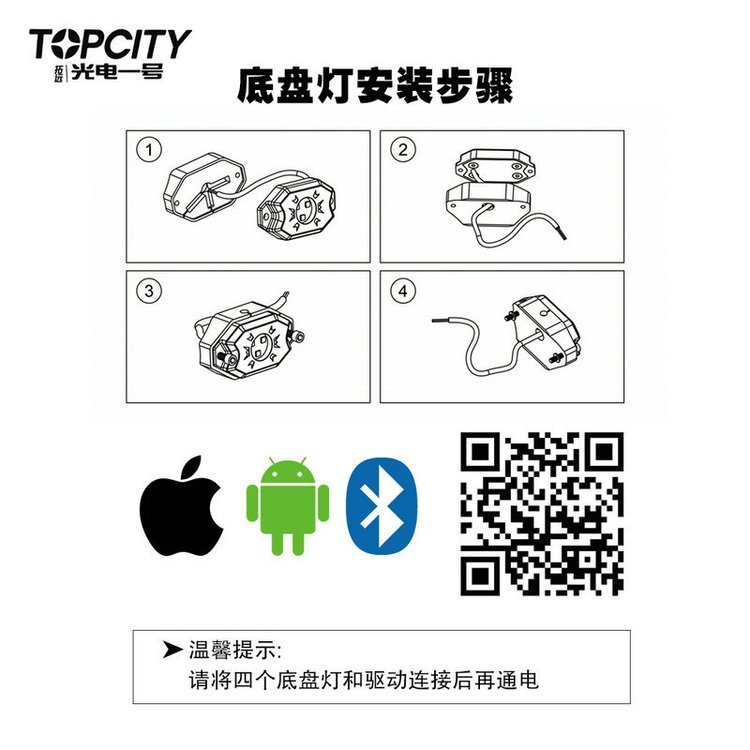 4、遥控,开关,蓝牙控制,通过苹果/安卓手机设置定时模式/音乐模式/爆闪模式/自动模式手机蓝牙控制,模式多变,宽电压设计,使用范围广泛,安装灵活方便简单